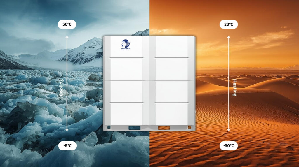 Questa certificazione garantisce che i sistemi VRF NØRDIS offrano prestazioni reali e testate, dando fiducia a installatori, progettisti e utenti finali. Dimostra inoltre che i prodotti NØRDIS sono pienamente conformi agli standard europei in materia di efficienza energetica e requisiti ambientali. Ampio intervallo di temperature di funzionamento I sistemi VRF NØRDIS sono progettati per operare in modo efficiente anche in climi estremi, da −30 °C a +56 °C, garantendo un raffrescamento e un riscaldamento affidabili durante tutto l’anno, indipendentemente dalle condizioni stagionali o ambientali, e offrendo soluzioni di comfort sostenibili per gli edifici moderni.
