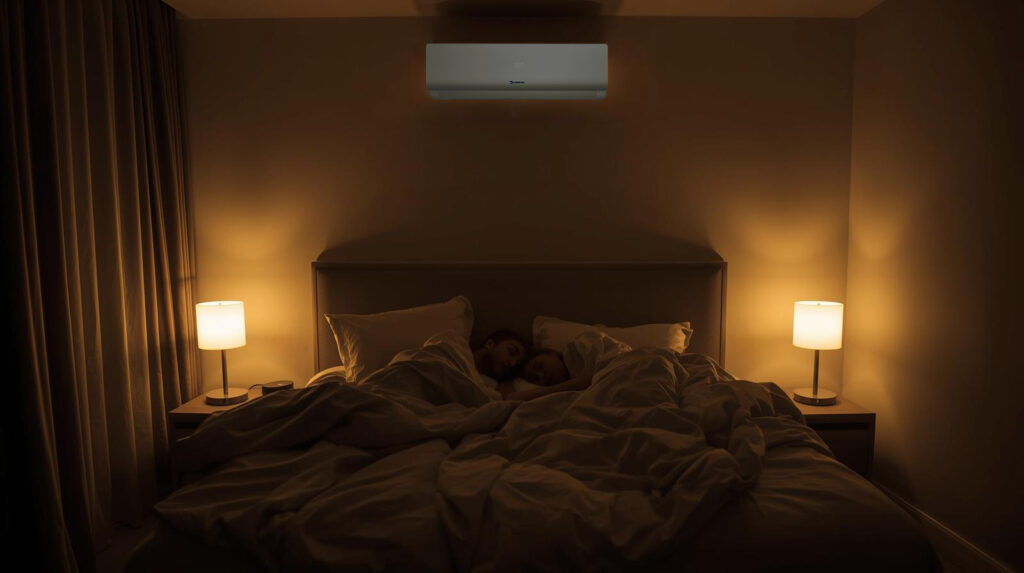 La funzione Modalità Notte è progettata per garantire un ambiente ideale per dormire, regolando automaticamente la temperatura di 1–2 °C ogni ora. Questa variazione graduale segue il naturale ritmo del sonno, evitando che la stanza diventi troppo fredda o troppo calda durante la notte. Il sistema mantiene un clima stabile e confortevole, aiutandoti ad addormentarti più velocemente e a riposare in modo più profondo e ininterrotto. Ottimizzando la temperatura e riducendo i livelli di rumore, la Modalità Notte assicura un funzionamento efficiente dal punto di vista energetico e un risveglio più piacevole ogni giorno.