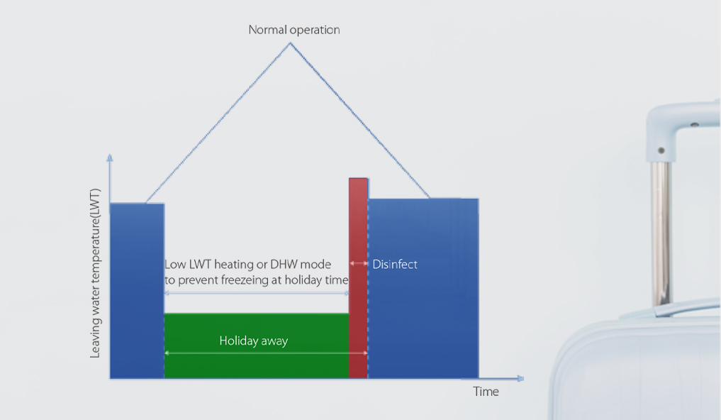La funzione Vacanza è una modalità pensata per migliorare l’affidabilità del sistema e ridurre i consumi energetici. Durante l’assenza, l’unità funziona in modalità riscaldamento e/o produzione di acqua calda sanitaria con una bassa temperatura dell’acqua, evitando il congelamento durante il periodo invernale. Prima del rientro, l’utente può preimpostare la modalità di disinfezione, assicurando la disponibilità di acqua igienicamente sicura.